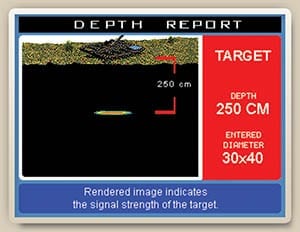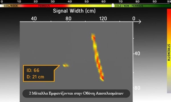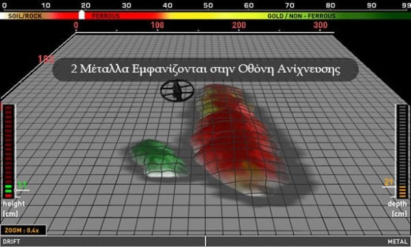 Η συσκευή δείχνει με ακρίβεια το βάθος του ανιχνευόμενου στόχου σε εκατοστά στην οθόνη του ανιχνευτή μετάλλων.