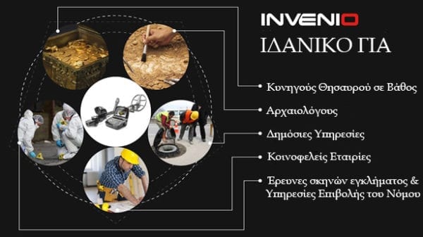 Στόχοι που μπορείτε να εντοπίσετε με το Invenio pro: Βαθιά κρυμμένους θησαυρούς, κρύπτες, νομίσματα, κειμήλια, εδαφικές ανωμαλίες / κοιλότητες όπως υπόγειες σπηλιές, σήραγγες κλπ. Με λίγα λόγια ότι μεταλλικό αντικείμενο υπάρχει και ψάχνετε κάτω από το έδαφος!