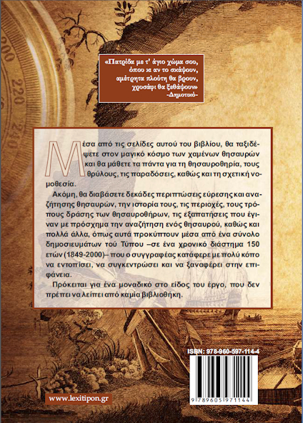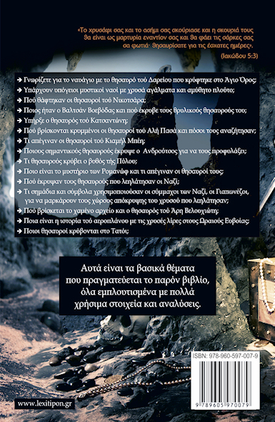 Στο νέο έργο του βρίσκονται συγκεντρωμένα περισσότερα από 200 οδοιπορικά που αναφέρονται σε κρυμμένους θησαυρούς στην Ελλάδα και στα Βαλκάνια, πίνακες με πάνω από 1000 κωδικά σημάδια και μυστικά σύμβολα που έχουν χρησιμοποιηθεί κατά καιρούς για το μαρκάρισμα σημείων και τόπων όπου έχουν κρυφτεί θησαυροί, ένα ολόκληρο κεφάλαιο για τις παγίδες θανάτου και τους κινδύνους με τους οποίους μπορεί να έρθει αντιμέτωπος ένας θησαυροθήρας, και τέλος, μία σπάνια συλλογή φωτογραφιών με σημάδια και τόπους θησαυρών από το αρχείο του συγγραφέα.