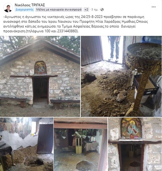 Σύμφωνα με όσα αναφέρει ο Νικόλαος Τρίγκας, διαχειριστής της ομάδας του χωριού στο Facebook, τα ξημερώματα της περασμένης Παρασκευής, άγνωστοι προέβησαν σε παράνομη ανασκαφή στο δάπεδο του Ιερού Ναΐσκου του Προφήτη Ηλία ψάχνοντας για κάποιον… κρυμμένο θησαυρό!
